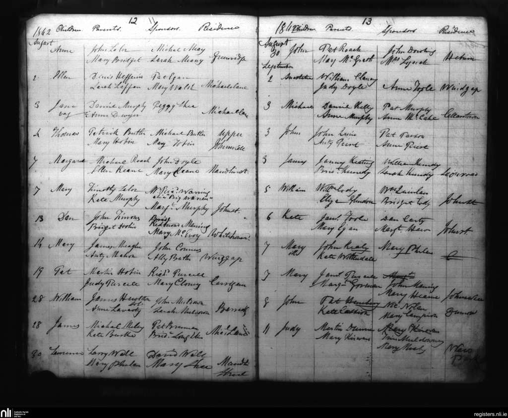 St. John's, Kilkenny city; County of Kilkenny; Diocese of Ossory. Baptisms, Aug. 1842 to Sep. 1842