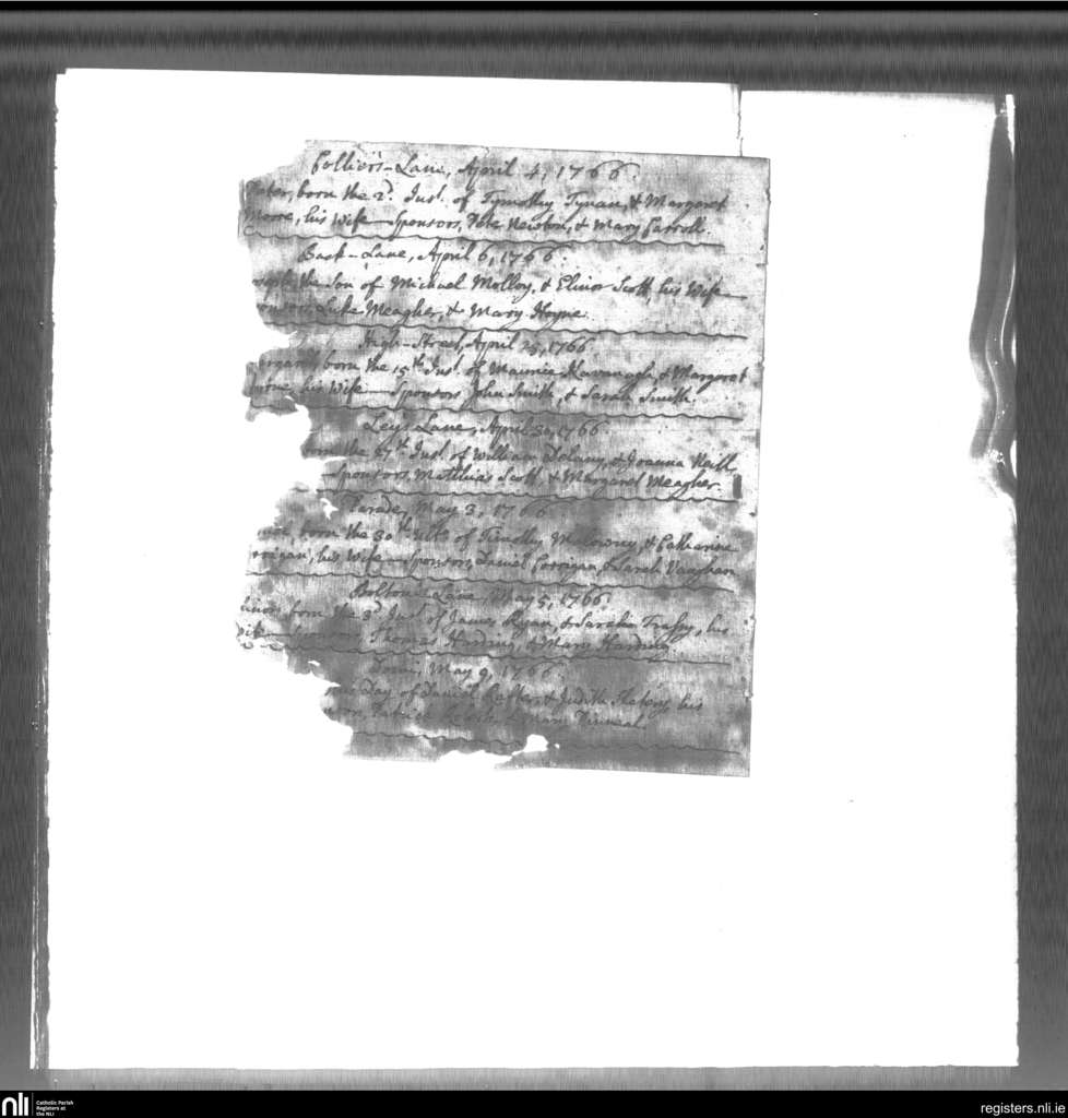 St. Mary's, Kilkenny city; County of Kilkenny; Diocese of Ossory. Baptisms, Apr. 1766 to May 1766