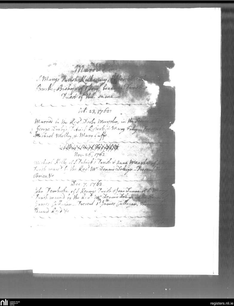 St. Mary's, Kilkenny city; County of Kilkenny; Diocese of Ossory. Marriages, Oct. 1762 to Dec. 1762