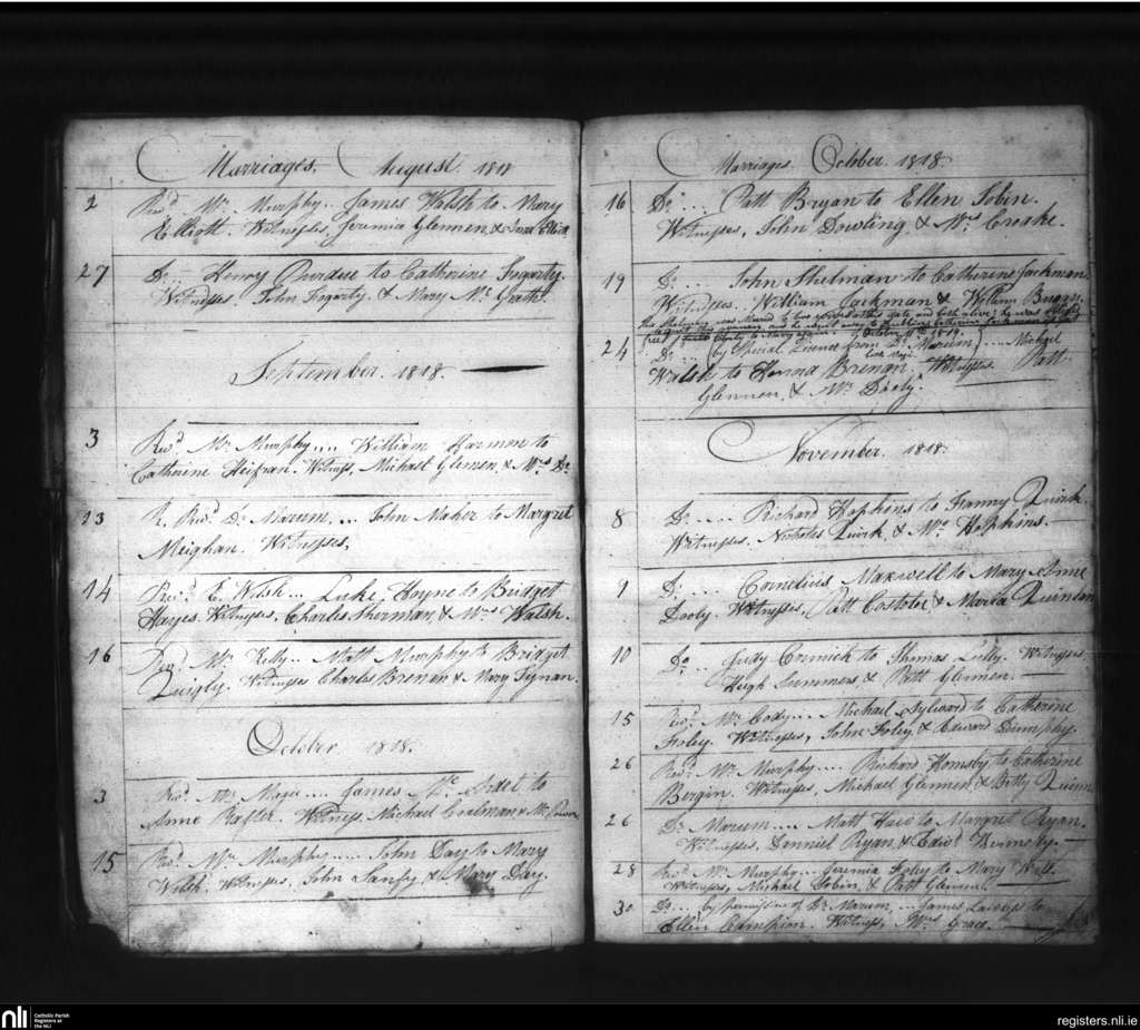 St. Mary's, Kilkenny city; County of Kilkenny; Diocese of Ossory. Marriages, Aug. 1818 to Nov. 1818