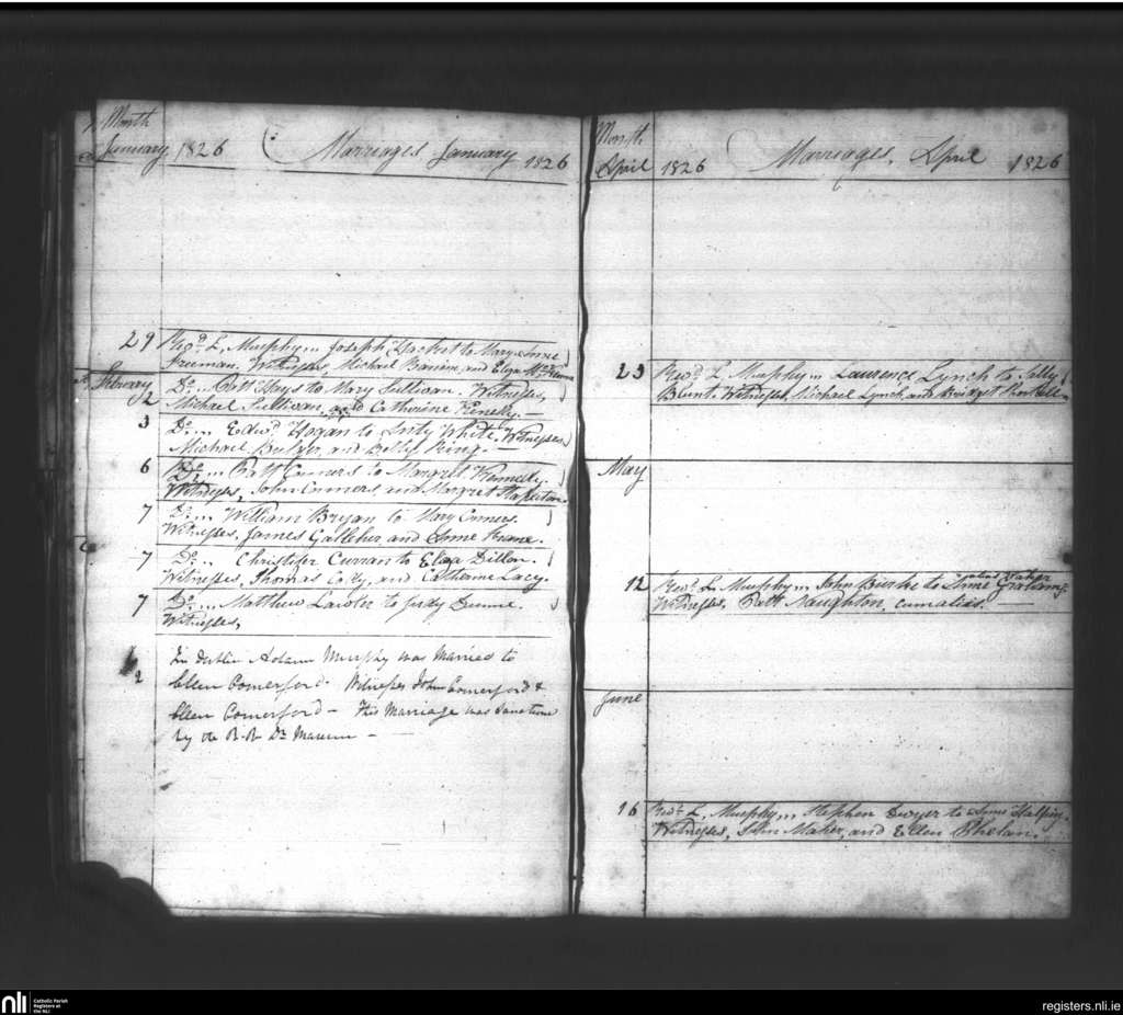 St. Mary's, Kilkenny city; County of Kilkenny; Diocese of Ossory. Marriages, Jan. 1826 to June 1826