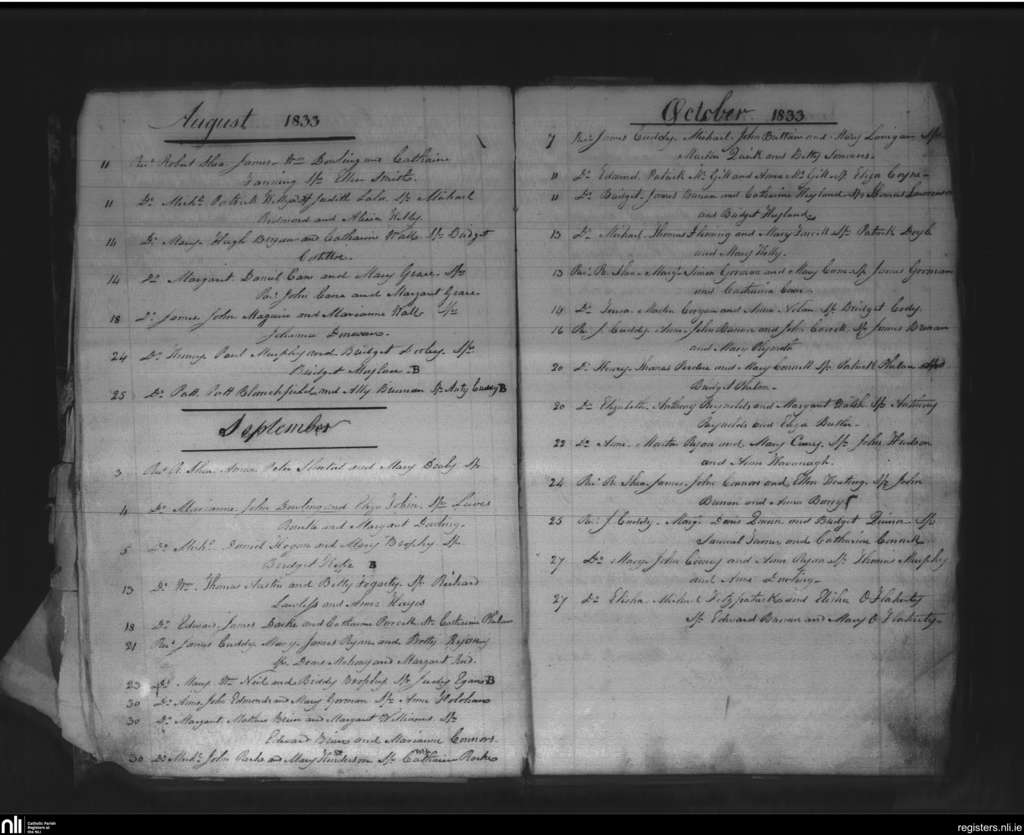 St. Mary's, Kilkenny city; County of Kilkenny; Diocese of Ossory. Baptisms, Aug. 1833 to Oct. 1833