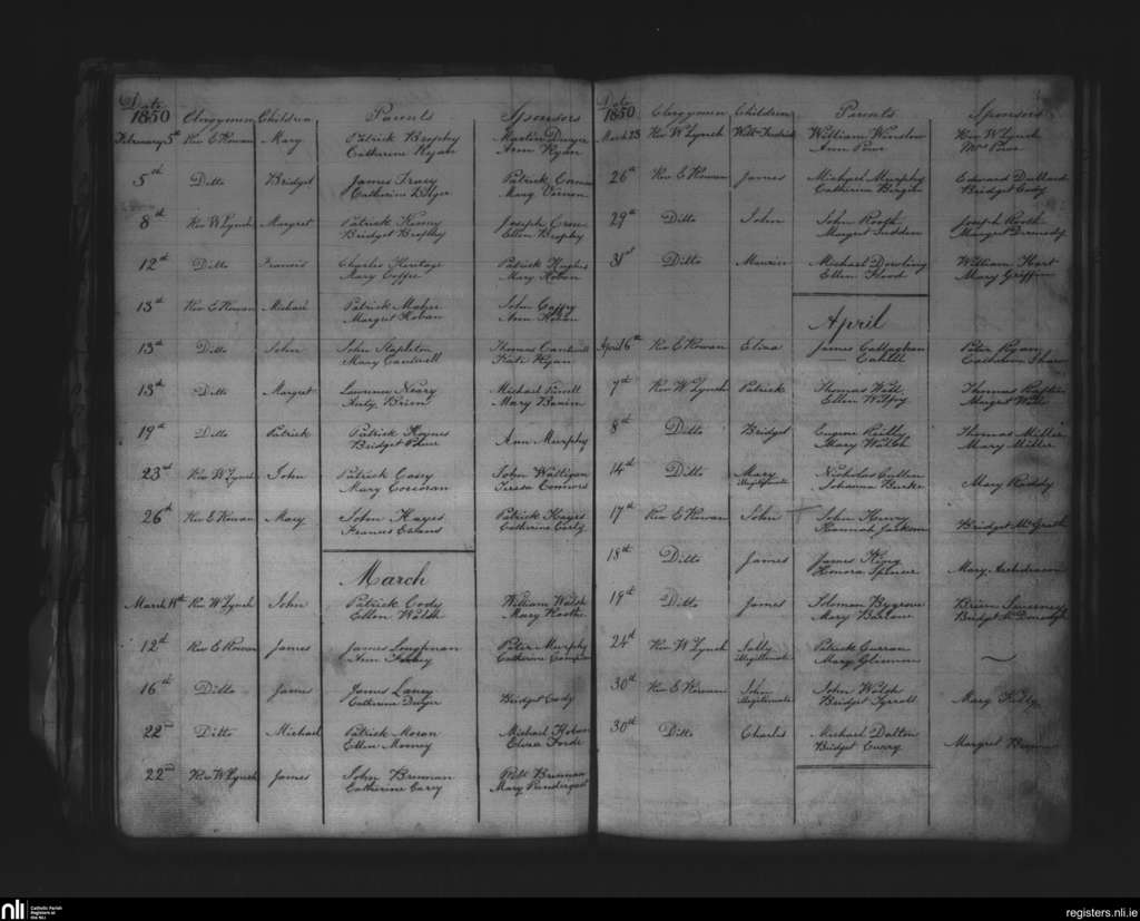 St. Mary's, Kilkenny city; County of Kilkenny; Diocese of Ossory. Baptisms, Feb. 1850 to Apr. 1850