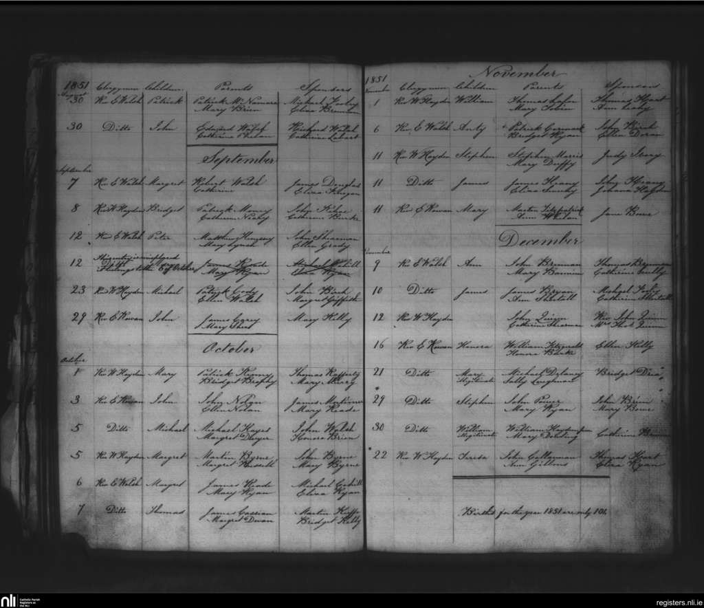 St. Mary's, Kilkenny city; County of Kilkenny; Diocese of Ossory. Baptisms, Aug. 1851 to Dec. 1851