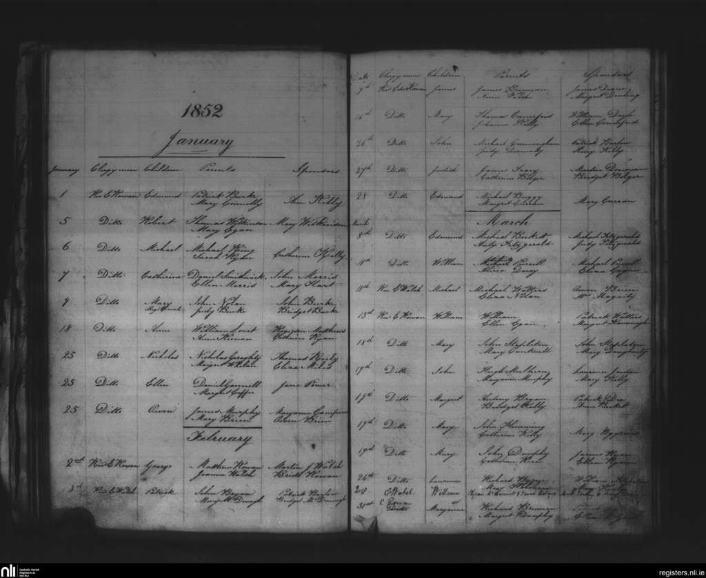 St. Mary's, Kilkenny city; County of Kilkenny; Diocese of Ossory. Baptisms, Jan. 1852 to Mar. 1852