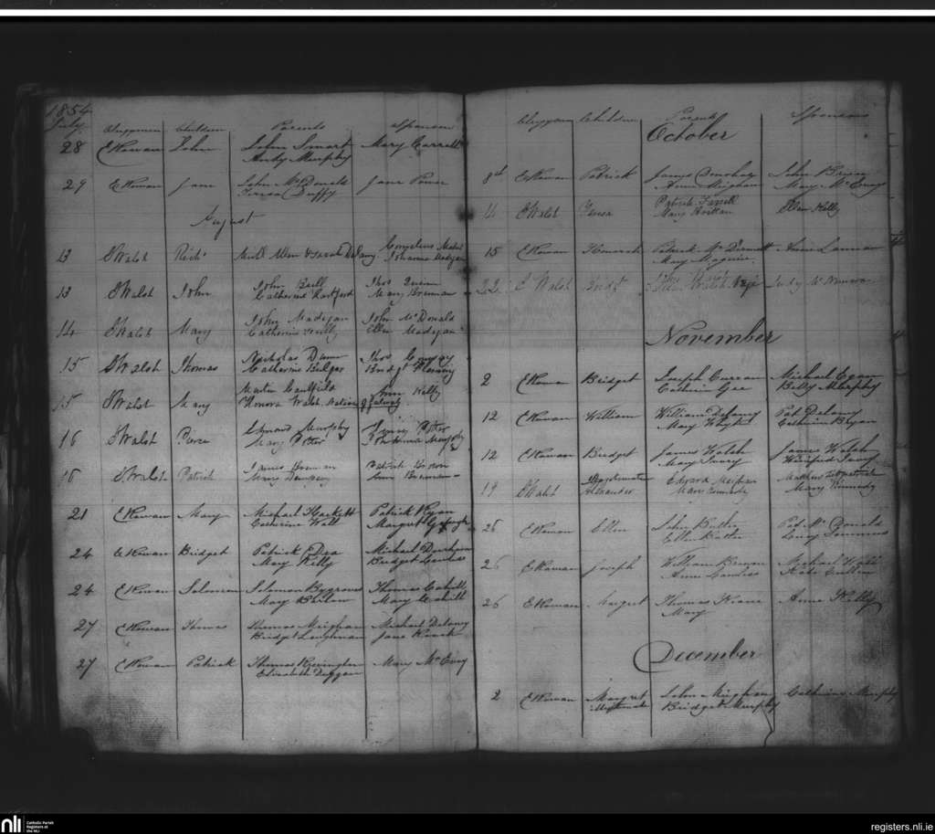 St. Mary's, Kilkenny city; County of Kilkenny; Diocese of Ossory. Baptisms, July 1854 to Dec. 1854