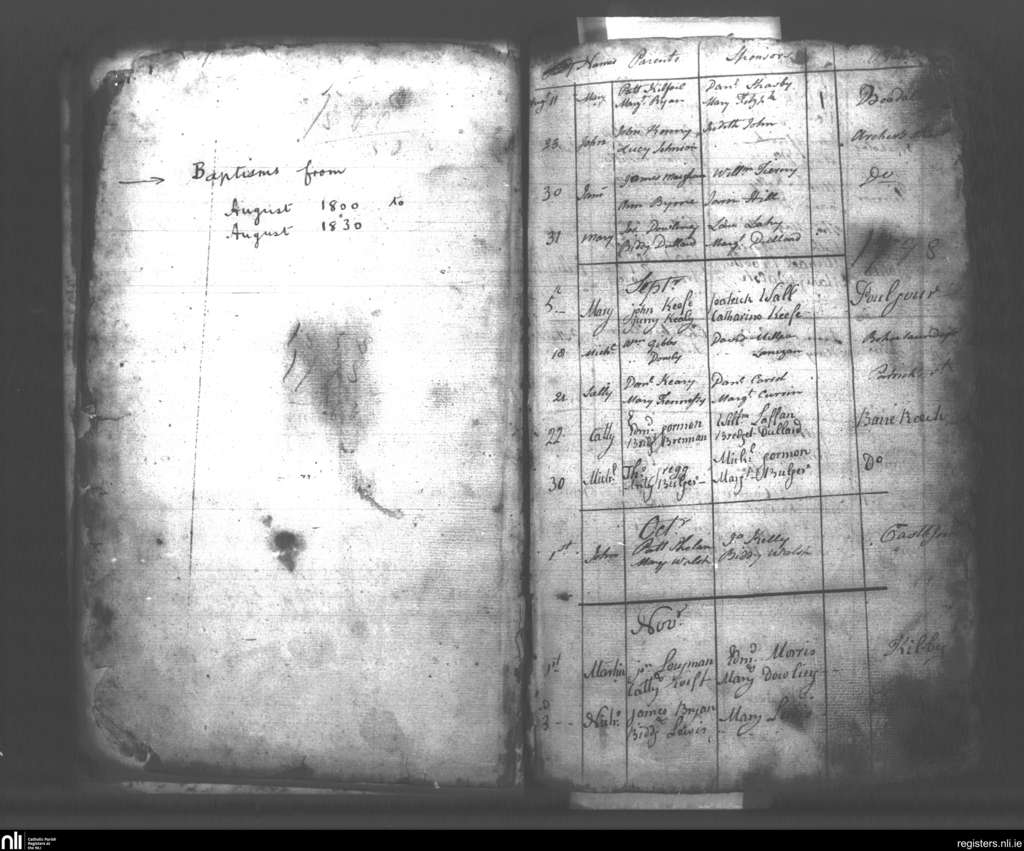 St. Patrick's, Kilkenny city; County of Kilkenny; Diocese of Ossory. Baptisms, Aug. 1800 to Nov. 1800