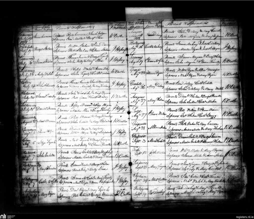 Lisdowney; County of Kilkenny, Laois; Diocese of Ossory. Baptisms, July 1818 to Sep. 1818