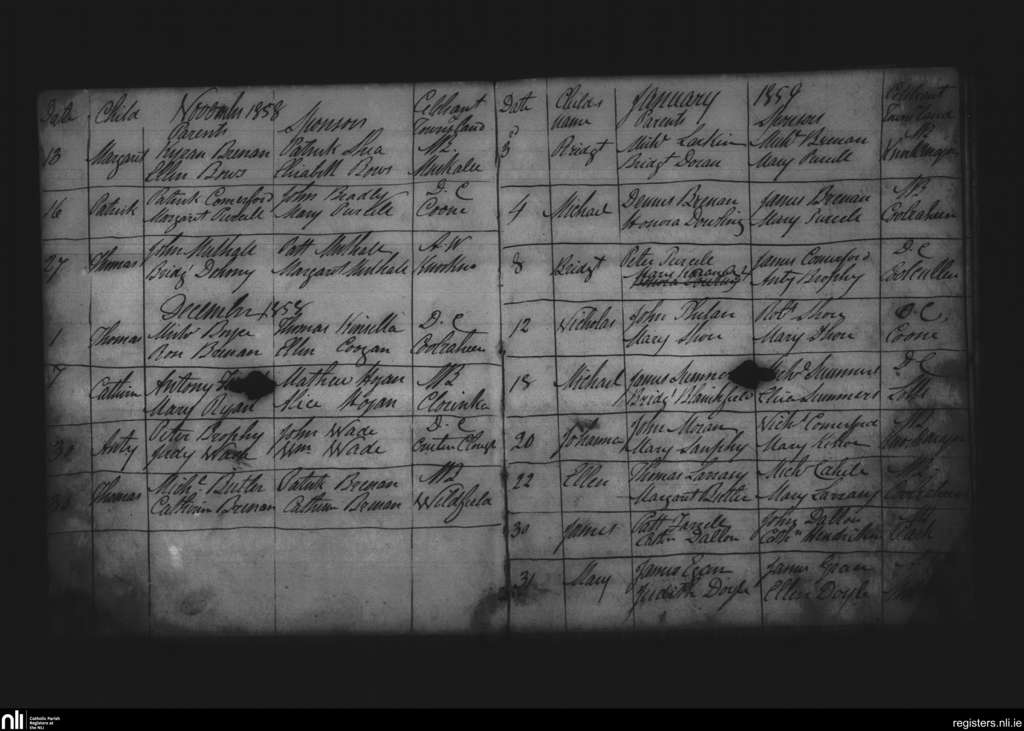 Muckalee; County of Kilkenny; Diocese of Ossory. Baptisms, Nov. 1858 to Jan. 1859