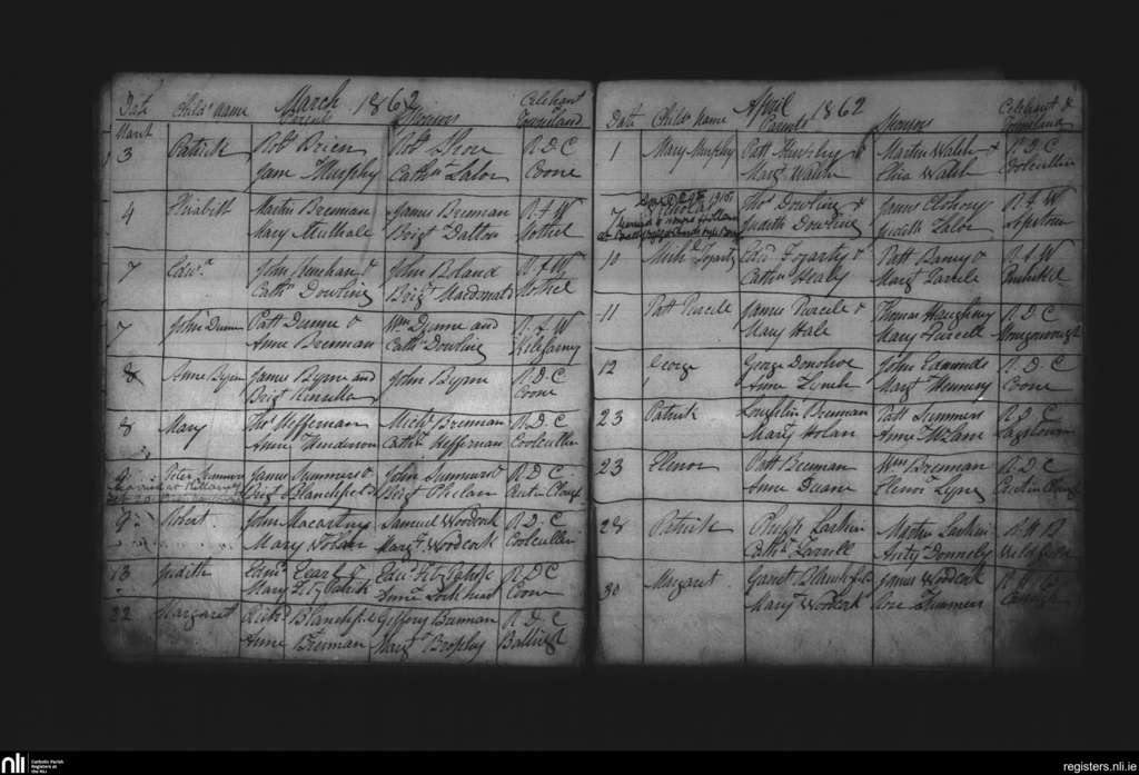 Muckalee; County of Kilkenny; Diocese of Ossory. Baptisms, Mar. 1862 to Apr. 1862