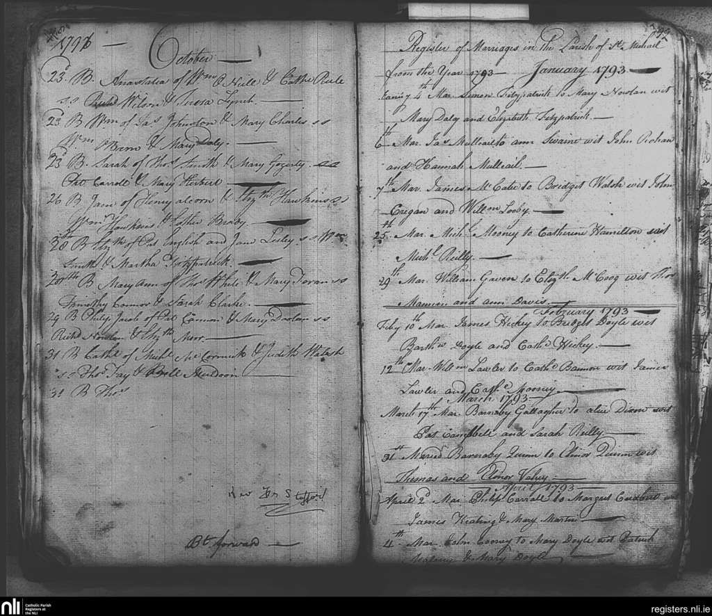 St. Michael and John's, Dublin city; County of Dublin; Archdiocese of Dublin. Marriages, Jan. 1793 to Oct. 1796