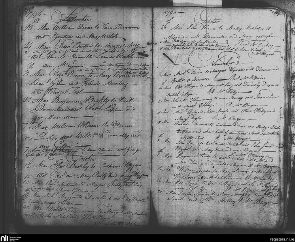 St. Michael and John's, Dublin city; County of Dublin; Archdiocese of Dublin. Marriages, Sep. 1794 to Nov. 1794
