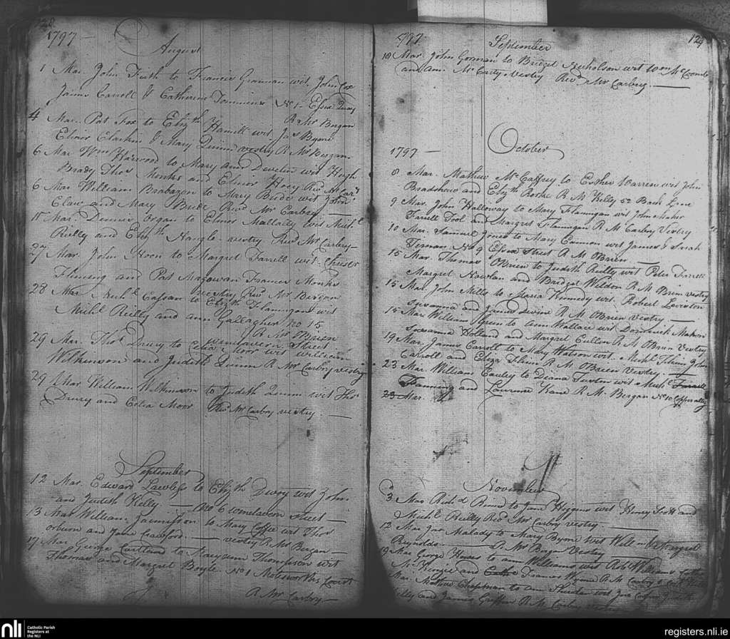St. Michael and John's, Dublin city; County of Dublin; Archdiocese of Dublin. Marriages, Aug. 1797 to Nov. 1797