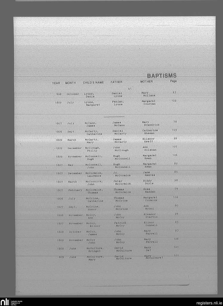 Mullingar; County of Westmeath; Diocese of Meath. Baptisms, Feb. 1807 to Dec. 1809