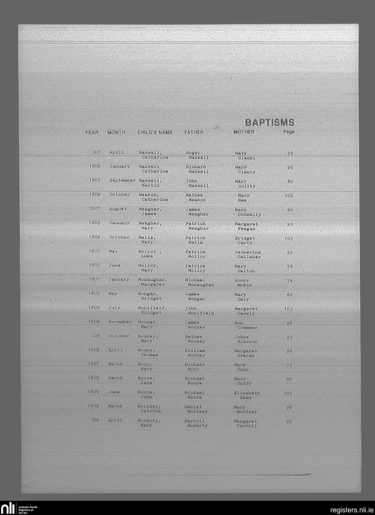 Mullingar; County of Westmeath; Diocese of Meath. Baptisms, Jan. 1807 to Oct. 1809