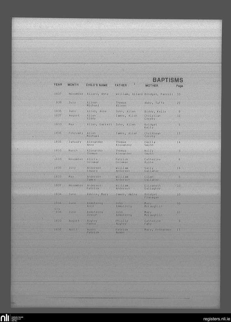 Mullingar; County of Westmeath; Diocese of Meath. Baptisms, Mar. 1833 to Nov. 1837