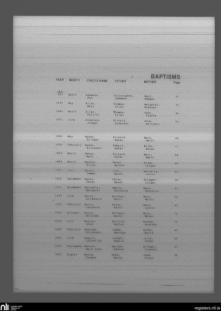 Mullingar; County of Westmeath; Diocese of Meath. Baptisms, Feb. 1849 to Oct. 1852