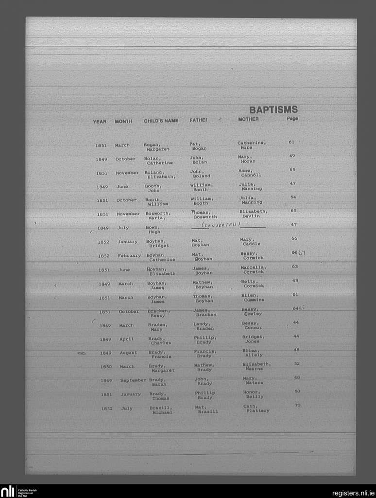 Mullingar; County of Westmeath; Diocese of Meath. Baptisms, Mar. 1849 to July 1852